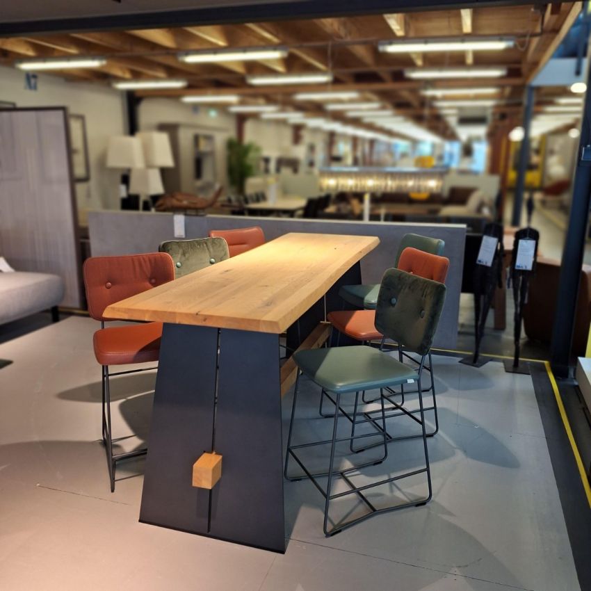 Set van 6 Bert Plantagie Kiko barkrukken met een Bert Plantagie Amar bartafel van eikenhout.