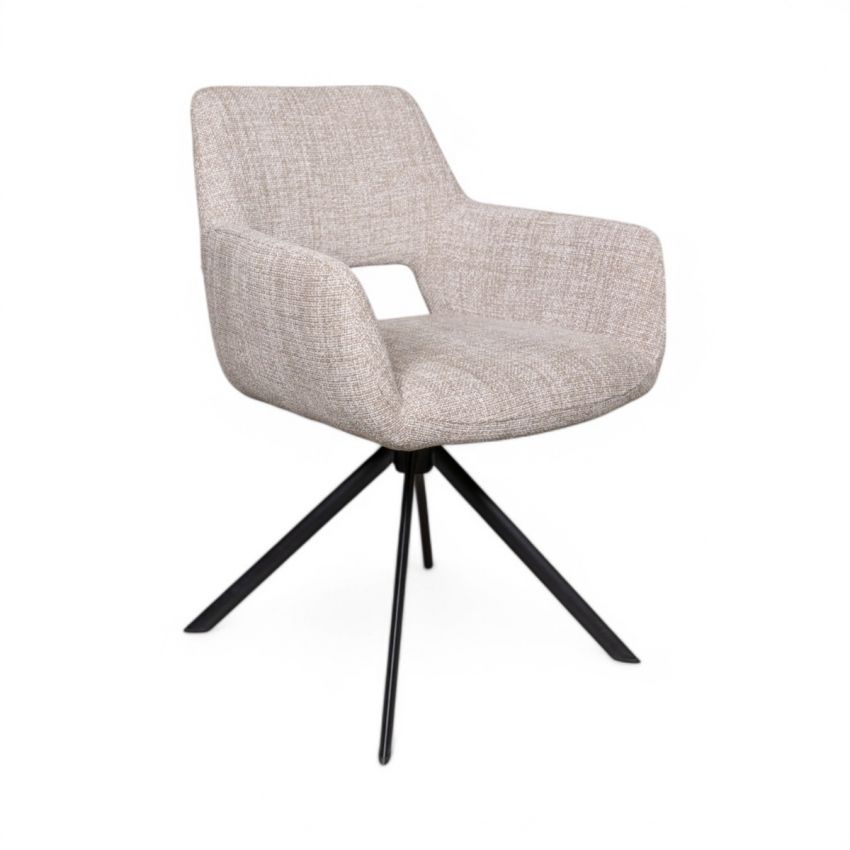 Nu leverbaar uit voorraad, zoals getoond in licht bruine stof Chacha (120) met draai-onderstel in zwart metaal.