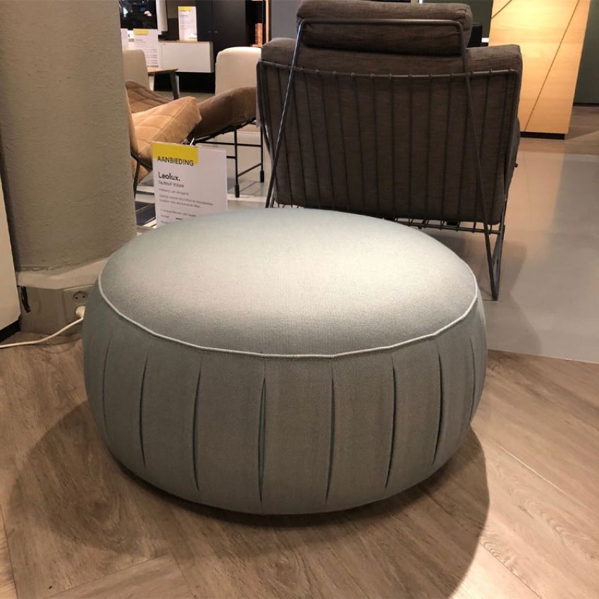 De Leolux Capri hocker is uitgevoerd in de stof Fezwool 51 met accenten van leder Ceras Tourmaline.