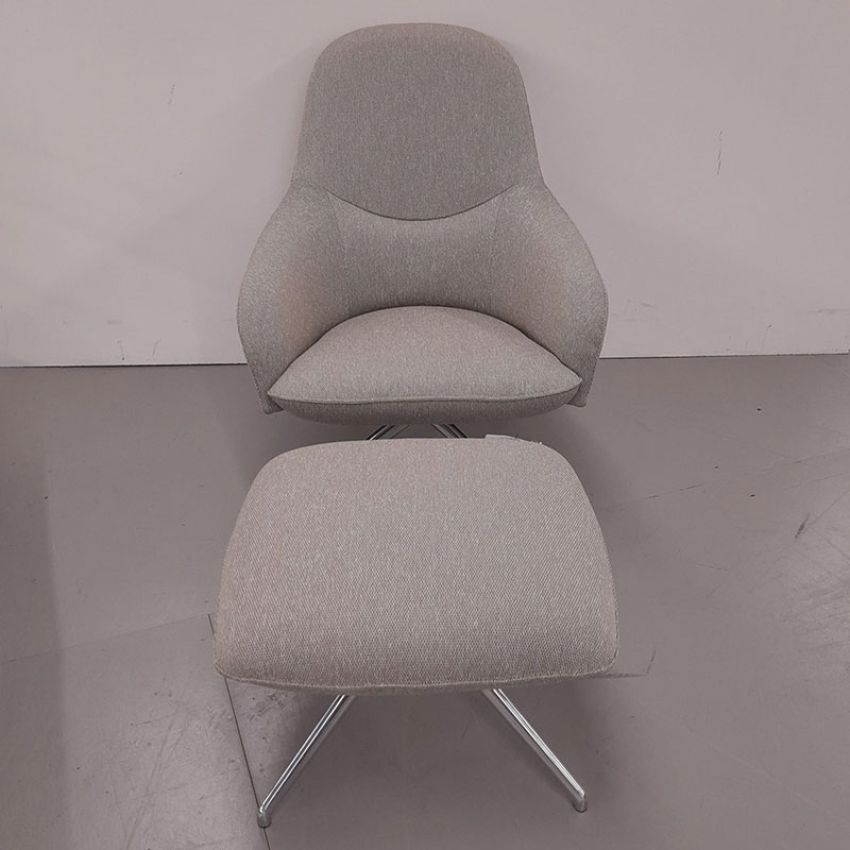 Fauteuil en hocker Lanah van Leolux. Uitgevoerd in de stof olive. Onderstel aluminium gepolijst.