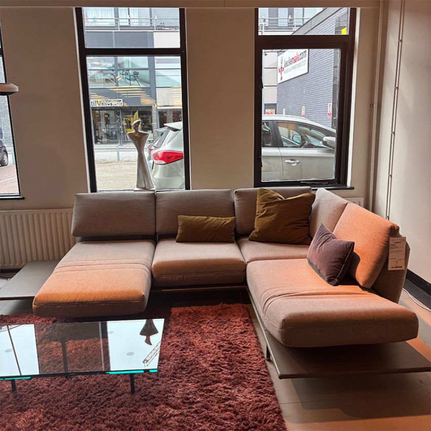 De Rolf Benz RB 388 Aura is uitgevoerd als hoekbank in de stof 20.255 Grijsbeige met een onderstel in gegoten aluminium.