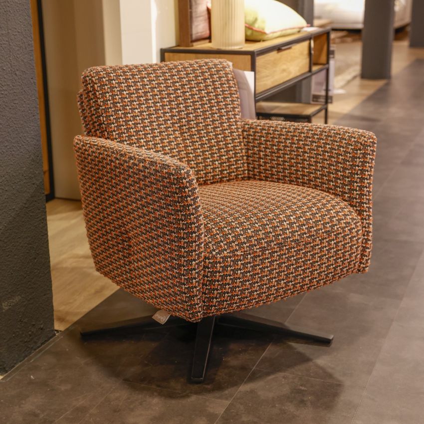 Alva draaifauteul van Rom, uitgevoerd in stof Lyrique Orange met zwart onderstel en boxspring-zitting.