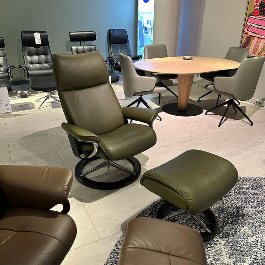 De Stressless Aura fauteuil en hocker zijn uitgevoerd in leder Paloma Dark Olive met een zwart (Signature) onderstel.